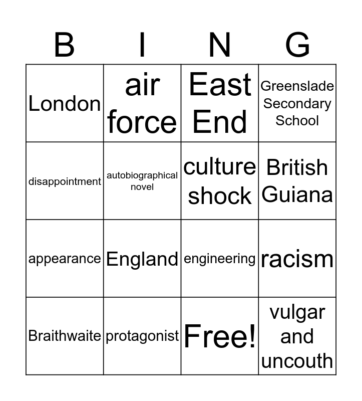 This bingo card has 17 words: Free!, Braithwaite, East End, London, England, Greenslade Secondary School, racism, culture shock, British Guiana, autobiographical novel, protagonist, engineering, disappointment, air force, appearance, bus and vulgar and uncouth.