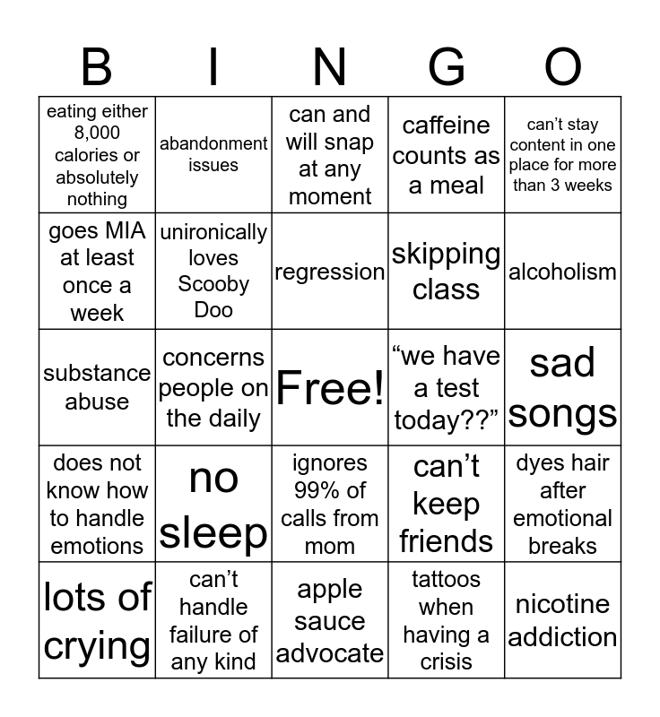 This bingo card has a free space and 24 words: no sleep, can’t handle failure of any kind, regression, lots of crying, can’t stay content in one place for more than 3 weeks, eating either 8,000 calories or absolutely nothing, goes MIA at least once a week, abandonment issues, “we have a test today??”, ignores 99% of calls from mom, skipping class, substance abuse, can’t keep friends, dyes hair after emotional breaks, unironically loves Scooby Doo, tattoos when having a crisis, sad songs, can and will snap at any moment, alcoholism, concerns people on the daily, nicotine addiction, does not know how to handle emotions, caffeine counts as a meal and apple sauce advocate.