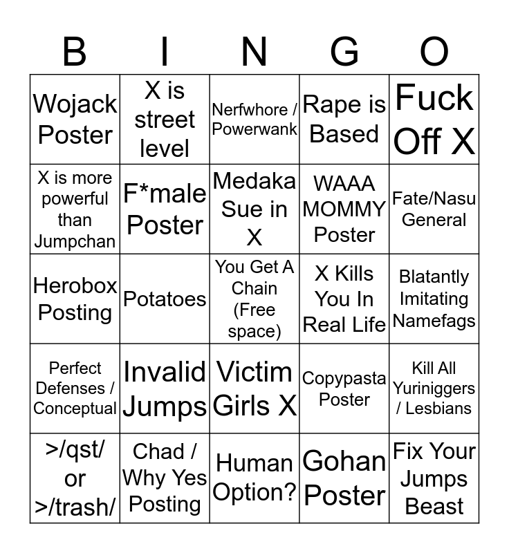 This bingo card has a free space and 49 words: Red Is A Tranny, Fix Your Jumps Beast, Beast is HOA, Human Option?, Invalid Jumps, Lore Isn't Canon, X is street level, World Seed, X is more powerful than Jumpchan, Jumping Wrong, F*male Poster, Rape is Based, Kill All Yuriniggers / Lesbians, Copypasta Poster, Cross Poster, X is Beast, Medaka Sue in X, X Kills You In Real Life, X is Totally Multiversal, Fuck Off X, Potatoes, Gohan Poster, Wojack Poster, WAAA MOMMY Poster, Cliffc/SB Posting, Fate/Nasu General, >/qst/ or >/trash/, Valeria Shitposting, Victim Girls X, Perfect Defenses / Conceptual, Trap Jump / Option, Consoom Product, Waifu Posting, /pol/ Posting, Chad / Why Yes Posting, Kanna Is Fat / Blubber Anon, Piss/Feet Anon, Astolfo / Futa Posting, Blatantly Imitating Namefags, Not Your Boogieman, >t. Poster, Shut Up X, All Jumpers / Average Jumper, By Community Consensus, Herobox Posting, Nerfwhore / Powerwank, Chris Chan / DSP, Bitching About Wildbow and Bitching About Comics.