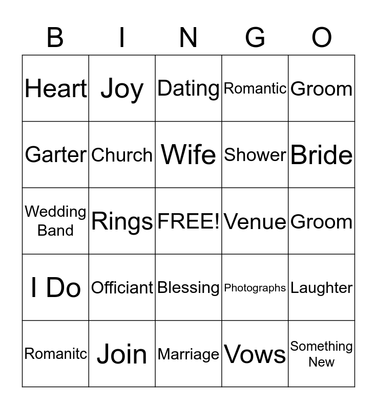 This bingo card has a free space and 37 words: Together, Boutonniere, Coarsage, Church, Laughter, Officiant, Wife, Courtship, Groom, Flower Girl, Rings, Romantic, Something New, Groom, Garter, I Do, Cake, Dating, Blessing, Venue, Heart, Bride, Romanitc, Marriage, In Laws, Vows, Joy, Maid of Honor, Church, Invitation, Couple, Join, Wedding Band, Something New, Photographs, Shower and License.