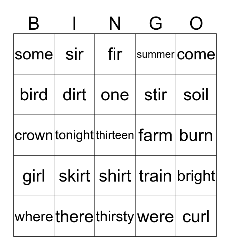 This bingo card has a free space and 24 words: skirt, there, one, where, come, some, bird, sir, farm, shirt, stir, crown, train, bright, dirt, were, burn, fir, soil, tonight, curl, girl, summer and thirsty.