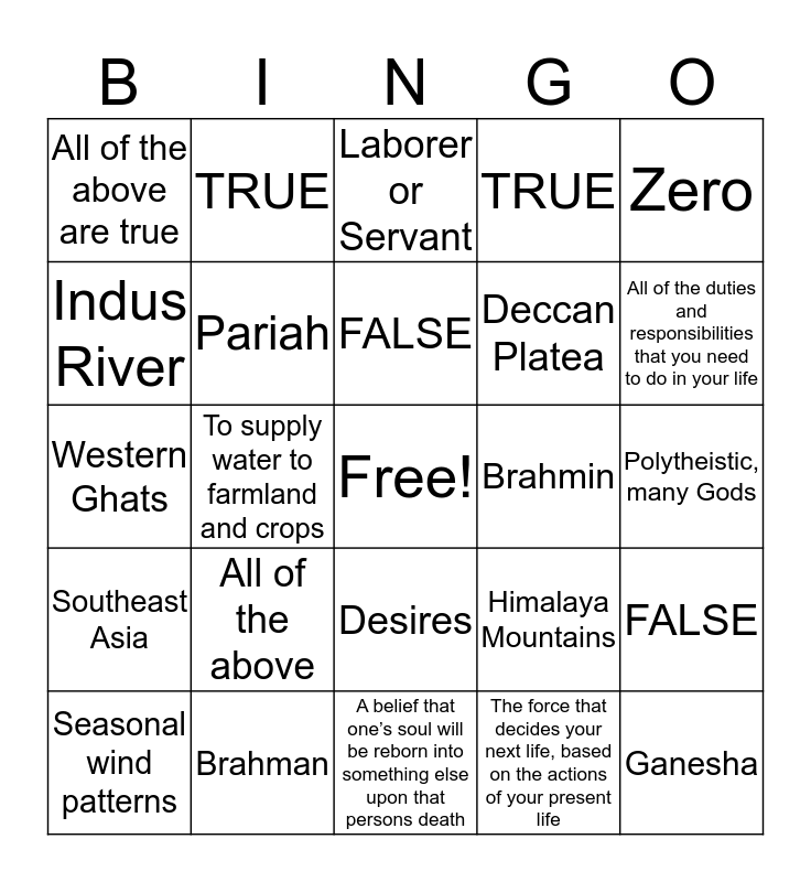 This bingo card has a free space and 29 words: Seasonal wind patterns, The winter monsoon is drier than the summer monsoon, To supply water to farmland and crops, Mohenjo Daro and Harappa, All of the above are true, Laborer or Servant, Pariah, All of the above, Brahmin, Brahman, Polytheistic, many Gods, Ganesha, A belief that one’s soul will be reborn into something else upon that persons death, The force that decides your next life, based on the actions of your present life, All of the duties and responsibilities that you need to do in your life, All of the above are true, Desires, Southeast Asia, Zero, Western Ghats, Himalaya Mountains, Sri Lanka, Deccan Platea, Indus River, TRUE, TRUE, FALSE, FALSE and TRUE.