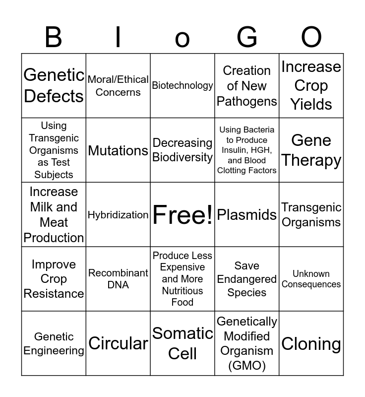 This bingo card has a free space and 29 words: Genetic Engineering, Selective Breeding, Hybridization, Inbreeding, Genetic Defects, Biotechnology, Mutations, Recombinant DNA, Plasmids, Circular, Transgenic Organisms, Cloning, Somatic Cell, Genetically Modified Organism (GMO), Gene Therapy, DNA Fingerprinting, Produce Less Expensive and More Nutritious Food, Improve Crop Resistance, Increase Crop Yields, Increase Milk and Meat Production, Save Endangered Species, Production of Vitamins, Antibodies, and Proteins, Using Bacteria to Produce Insulin, HGH, and Blood Clotting Factors, Using Transgenic Organisms as Test Subjects, Creation of New Pathogens, Moral/Ethical Concerns, Unknown Consequences, Decreasing Biodiversity and Shorter.