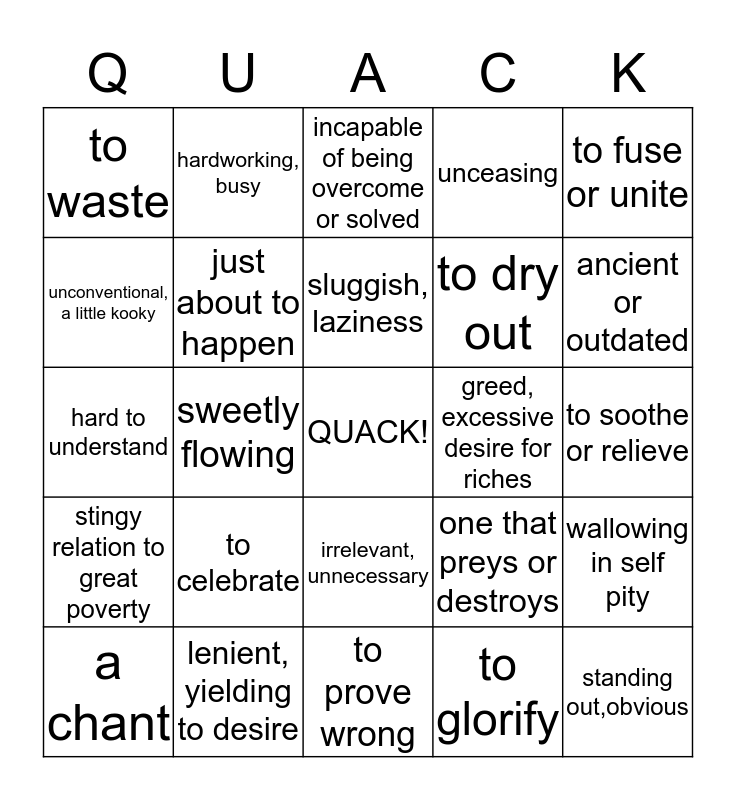 This bingo card has a free space and 24 words: a chant, to celebrate, sluggish, laziness, to glorify, to fuse or unite, to waste, hardworking, busy, incapable of being overcome or solved, greed, excessive desire for riches, to soothe or relieve, hard to understand, just about to happen, one that preys or destroys, wallowing in self pity, unconventional, a little kooky, lenient, yielding to desire, to prove wrong, unceasing, ancient or outdated, stingy relation to great poverty, sweetly flowing, irrelevant, unnecessary, to dry out and standing out,obvious.