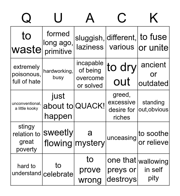 This bingo card has a free space and 29 words: a chant, to celebrate, sluggish, laziness, to glorify, to fuse or unite, to waste, hardworking, busy, incapable of being overcome or solved, greed, excessive desire for riches, to soothe or relieve, hard to understand, just about to happen, one that preys or destroys, wallowing in self pity, unconventional, a little kooky, lenient, yielding to desire, to prove wrong, unceasing, ancient or outdated, stingy relation to great poverty, sweetly flowing, irrelevant, unnecessary, to dry out, standing out,obvious, extremely poisonous, full of hate, formed long ago, primitive, a mystery, different, various and easy to understand.