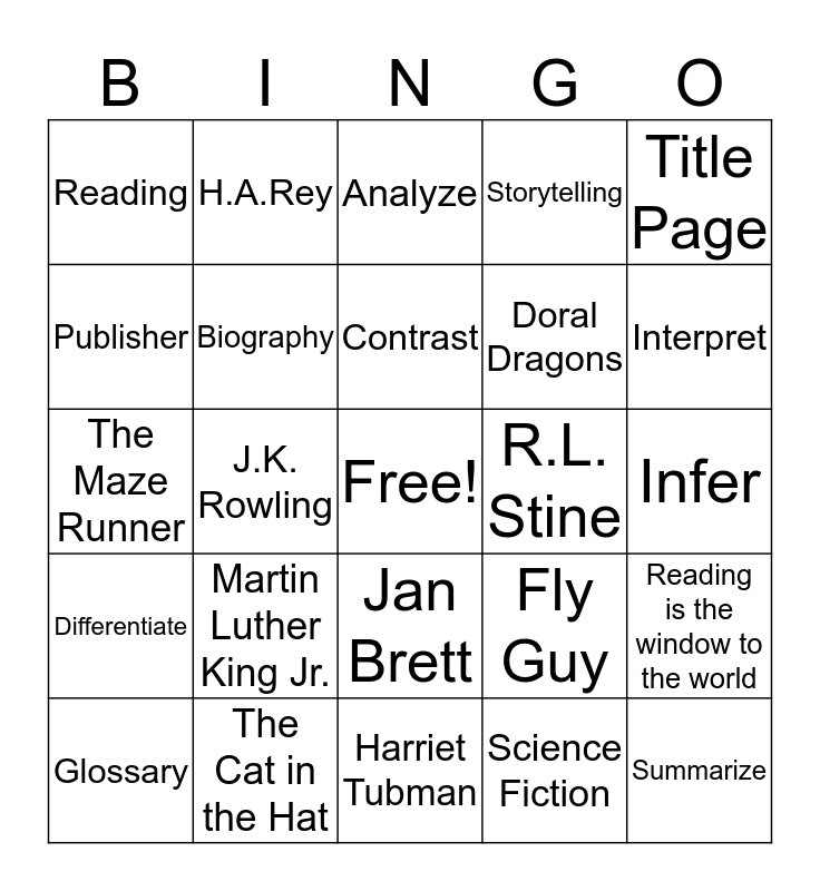 This bingo card has a free space and 24 words: Martin Luther King Jr., The Cat in the Hat, Contrast, Glossary, Title Page, Reading, Publisher, H.A.Rey, R.L. Stine, Jan Brett, Doral Dragons, The Maze Runner, Fly Guy, Reading is the window to the world, Biography, Science Fiction, Infer, Analyze, Interpret, J.K. Rowling, Summarize, Differentiate, Storytelling and Harriet Tubman.