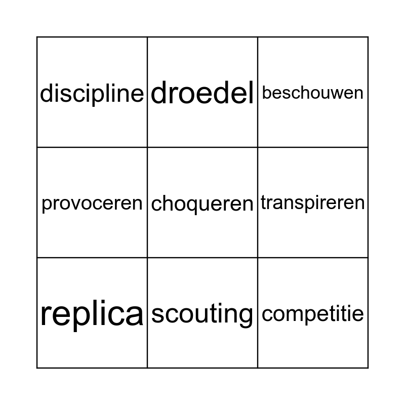 This bingo card has 10 words: replica, droedel, beschouwen, provoceren, choqueren, competitie, discipline, scouting, transpireren and olympisch.