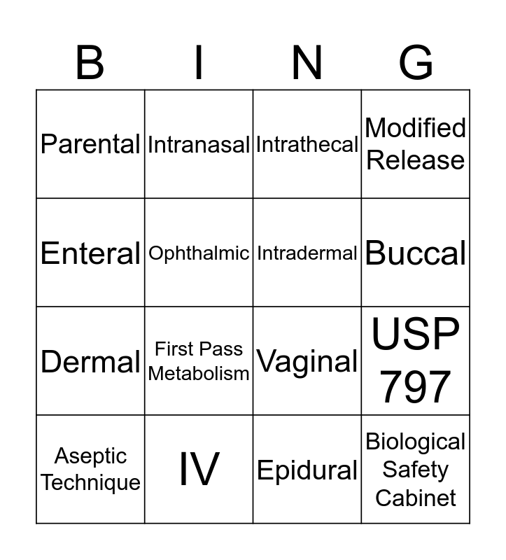 This bingo card has 24 words: Oral, Sublingual, Buccal, Rectal, Enteral, Parental, Ophthalmic, Intranasal, IV, inhalation, Dermal, Vaginal, Otic, IM, Intradermal, SubQ, Epidural, Intrathecal, First Pass Metabolism, USP 797, Aseptic Technique, Biological Safety Cabinet, Modified Release and pH.