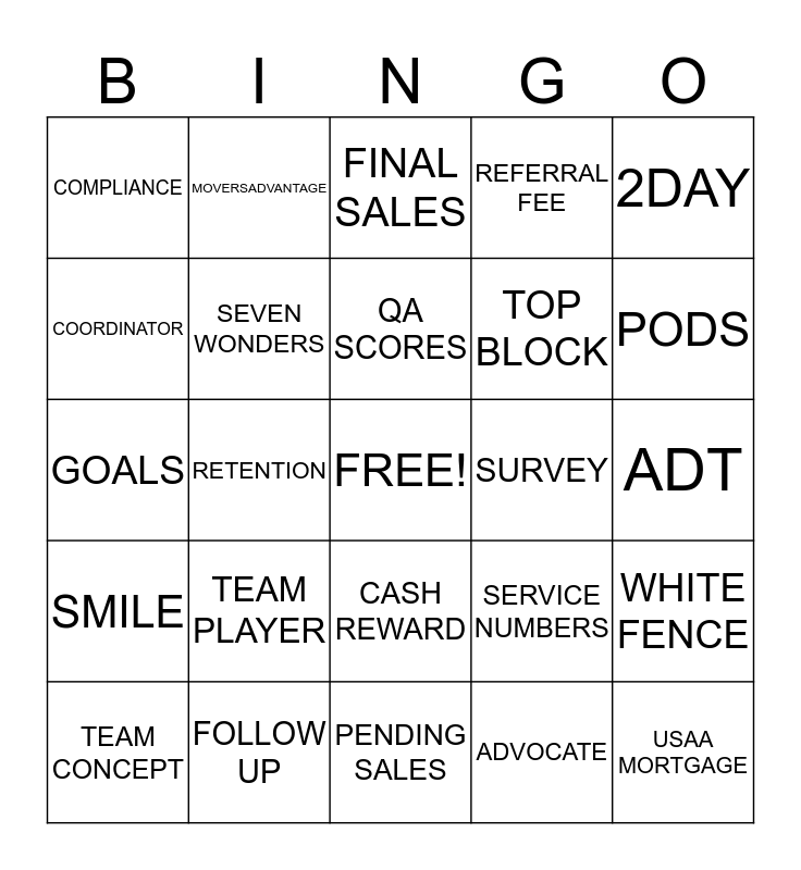 This bingo card has a free space and 24 words: TEAM PLAYER, FOLLOW UP, QA SCORES, TEAM CONCEPT, 2DAY, COMPLIANCE, COORDINATOR, MOVERSADVANTAGE, SURVEY, CASH REWARD, TOP BLOCK, GOALS, SERVICE NUMBERS, WHITE FENCE, SEVEN WONDERS, ADVOCATE, ADT, FINAL SALES, PODS, RETENTION, USAA MORTGAGE, SMILE, REFERRAL FEE and PENDING SALES.