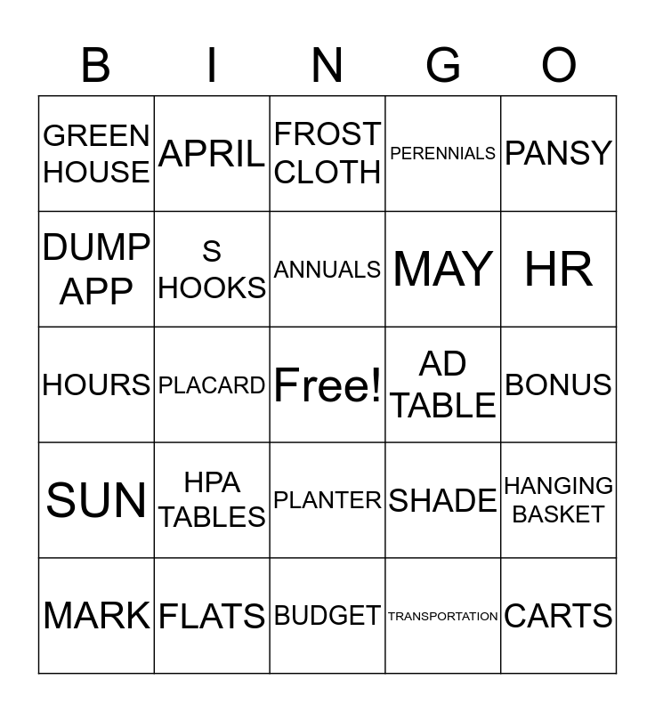 This bingo card has a free space and 24 words: MARK, HPA TABLES, ANNUALS, TRANSPORTATION, PANSY, GREEN HOUSE, APRIL, FROST CLOTH, AD TABLE, BONUS, HOURS, S HOOKS, SHADE, HANGING BASKET, DUMP APP, FLATS, BUDGET, PERENNIALS, HR, SUN, PLACARD, PLANTER, MAY and CARTS.