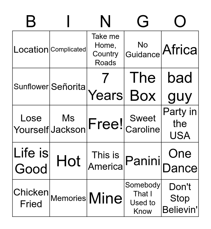This bingo card has a free space and 62 words: Yummy, Memories, Truth Hurts, Life is Good, Old Town Road, Fireflies, Señorita, thank u, next, The Box, Roxanne, No Guidance, Hot Girl Summer, Sunflower, HIGHEST IN THE ROOM, Can't Stop the Feeling, Location, Don't Stop Believin', Africa, Sweet Home Alabama, 7 Years, Sweet Caroline, Take me Home, Country Roads, Chicken Fried, Somebody That I Used to Know, Rather Be, We Don't Talk Anymore, Stereo Heart, God's Plan, One Dance, Love Lies, Mr. Brightside, Dynamite, Magic, I Write Sins Not Tragedies, Party in the USA, Complicated, September, Bye Bye Bye, Ms Jackson, Firework, Lose Yourself, Promiscuous, Hot, Congratulations, bad guy, Panini, Ransom, Shape of You, iSpy, Lucid Dreams, This is America, Mine, Meant to Be, Starboy, Unforgettable, Despacito, SICKO MODE, Without Me, Shallow, Goodbyes, Happier and Wagon Wheel.