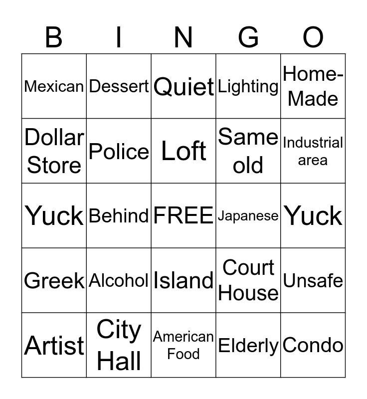 This bingo card has a free space and 24 words: Artist, Alcohol, Loft, Elderly, Home-Made, Mexican, Dessert, Quiet, Japanese, Yuck, Yuck, Police, Court House, Unsafe, Dollar Store, City Hall, American Food, Lighting, Industrial area, Greek, Behind, Island, Same old and Condo.