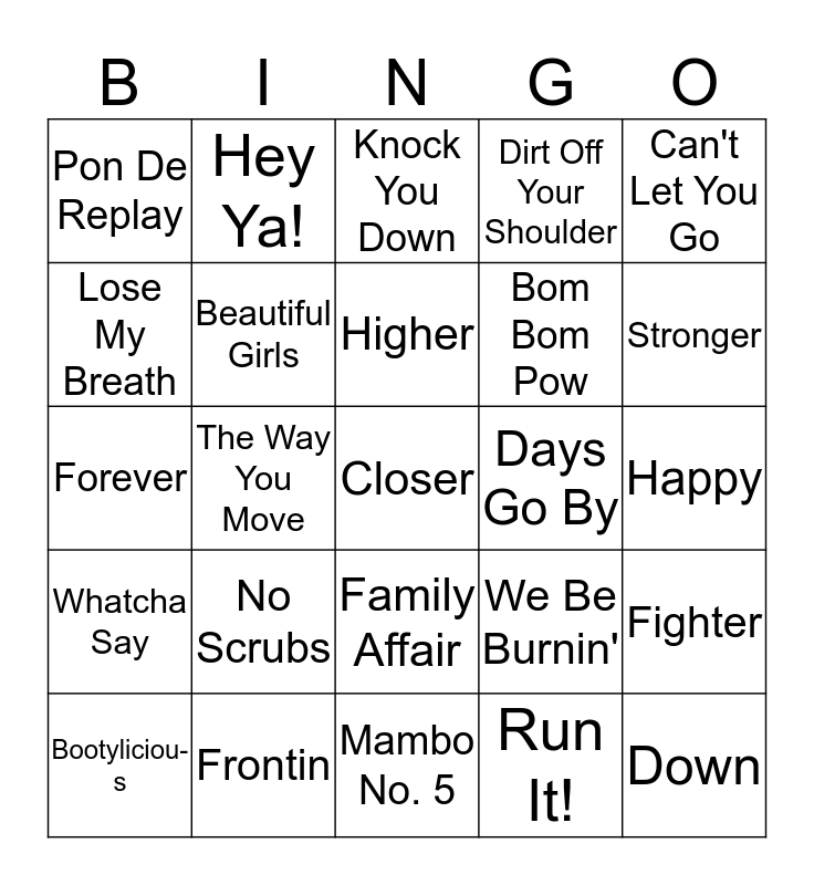 This bingo card has 35 words: Love Like This, Break Your Heart, Just A Friend, Beautiful Girls, Family Affair, Dirt Off Your Shoulder, Lose My Breath, Headstrong, Higher, Leave, Forever, Can't Let You Go, Free!, How We Do, Pon De Replay, Days Go By, Run It!, The Way You Move, Whatcha Say, Closer, We Be Burnin', Bootyliciou-s, Fighter, Frontin, Knock You Down, Stronger, Down, Replay, Bom Bom Pow, Happy, Baby Boy, Mambo No. 5, No Scrubs, Hey Ya! and Who Let The Dogs Out.
