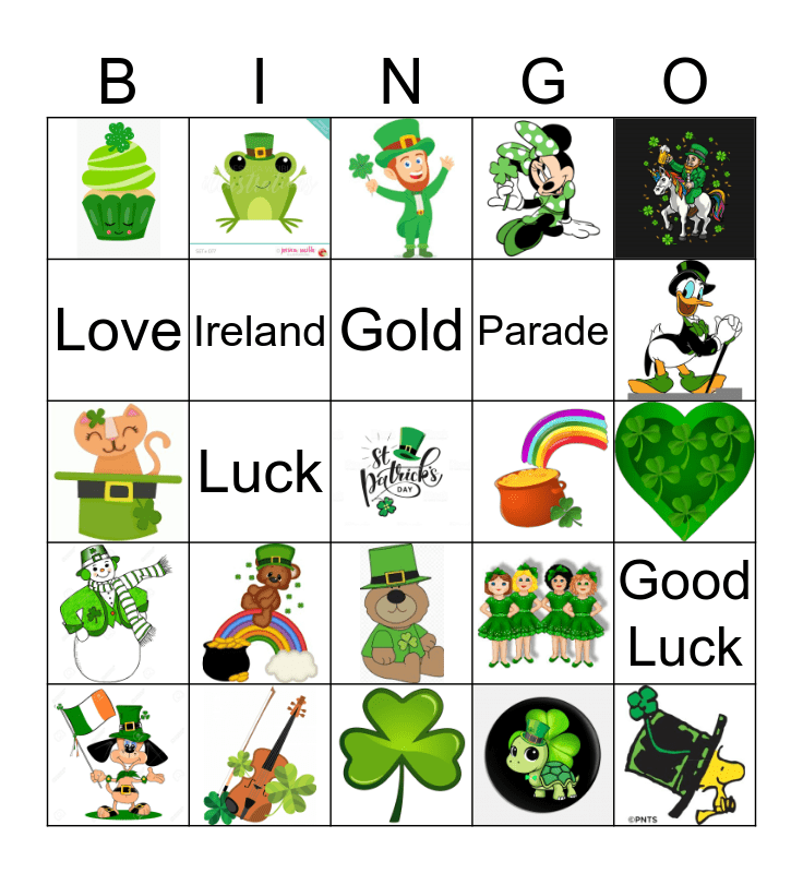 This bingo card has 31 images, a free space and 13 words: Good Luck, Luck of the Irish, Irish, Luck, Green, Dancing, Rainbow, Gold, Love, Parade, Clover, Ireland and 100% Irish.