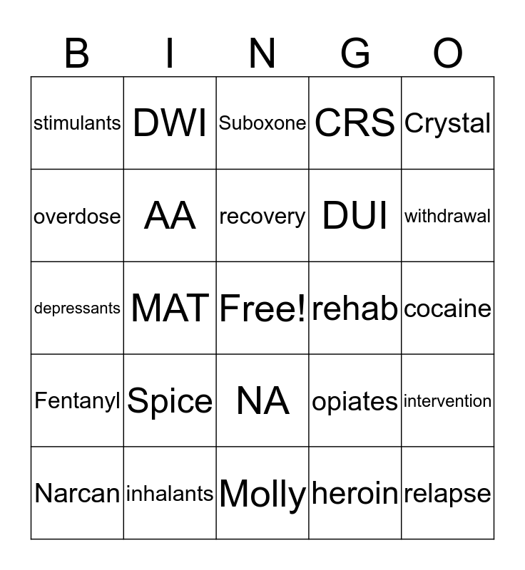 This bingo card has a free space and 24 words: Spice, inhalants, recovery, Narcan, Crystal, stimulants, overdose, DWI, rehab, NA, DUI, depressants, opiates, intervention, AA, heroin, cocaine, Suboxone, withdrawal, MAT, relapse, Fentanyl, CRS and Molly.