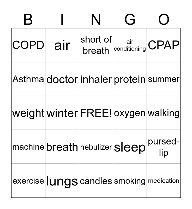 This bingo card has a free space and 24 words: breath, lungs, inhaler, exercise, CPAP, COPD, Asthma, air, oxygen, nebulizer, protein, weight, sleep, pursed-lip, doctor, smoking, walking, short of breath, summer, winter, medication, machine, air conditioning and candles.