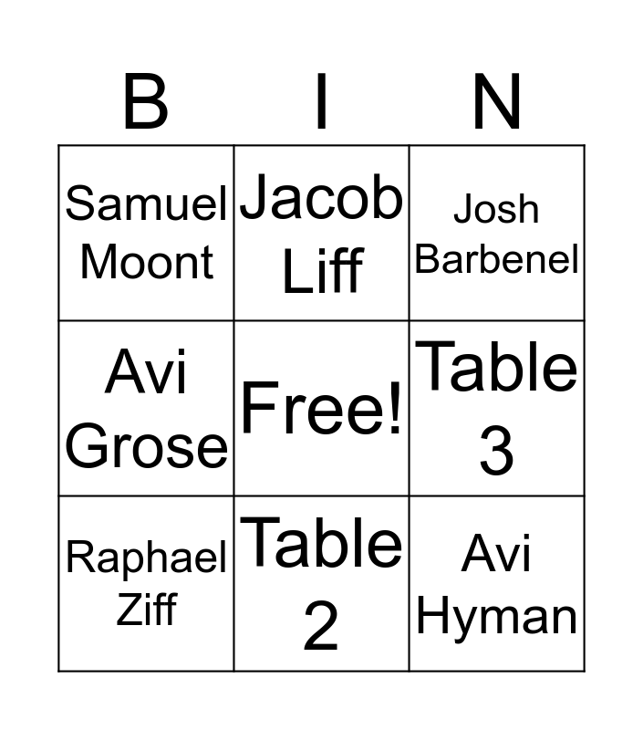 This bingo card has a free space and 25 words: Samuel Mellish, Ilan moont, Table 2, Benjamin Liff, Avi Hyman, Samuel Moont, Table 3, Jacob Liff, Nathan Cohen, Netanel Moor, Table 4, Izzy Yantin, Tali Notowitz, Never forman, Raphael Ziff, Jodi Deacon, Table 5, Josh Barbenel, Brett koskky, Ashriel Morris, Table 6, Ariella summers, Lucie Levine, Avi Grose and Asher Friedman.
