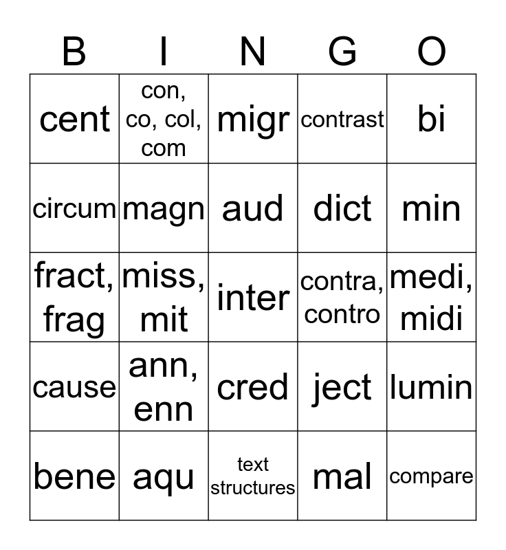 This bingo card has a free space and 24 words: ann, enn, aqu, aud, bene, bi, cent, circum, con, co, col, com, contra, contro, cred, dict, fract, frag, ject, lumin, magn, mal, medi, midi, migr, min, miss, mit, compare, cause, contrast and text structures.