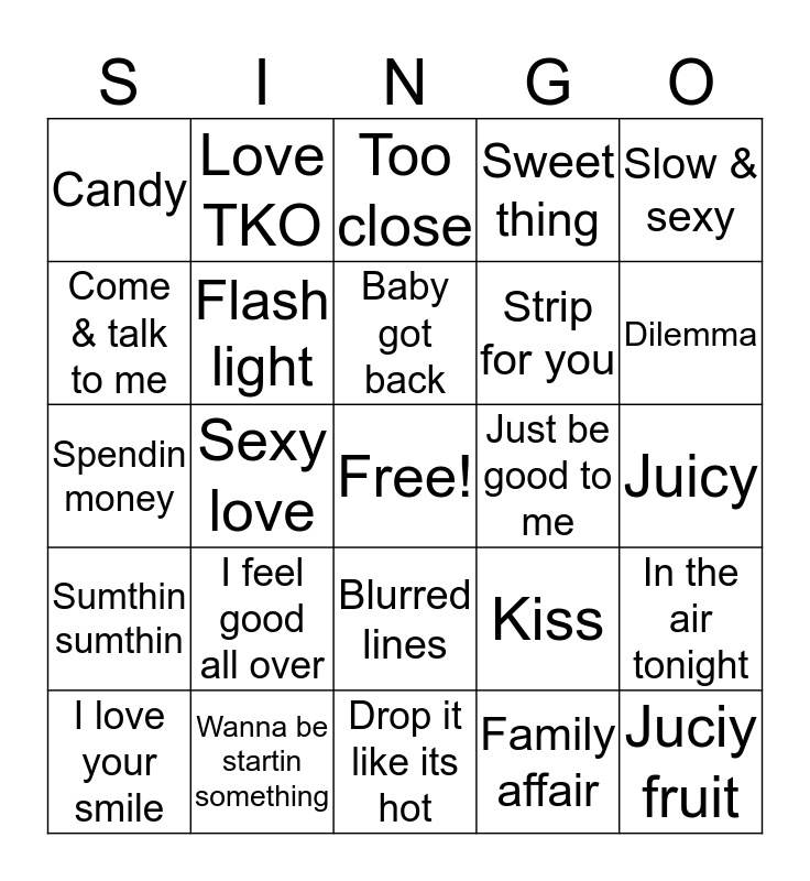 This bingo card has a free space and 25 words: I feel good all over, Drop it like its hot, Baby got back, I love your smile, Slow & sexy, Candy, Come & talk to me, Love TKO, Just be good to me, Blurred lines, Strip for you, Spendin money, Kiss, In the air tonight, Flash light, Ms Jackson, Juicy, Too close, Dilemma, Sexy love, Juciy fruit, Wanna be startin something, Sumthin sumthin, Sweet thing and Family affair.