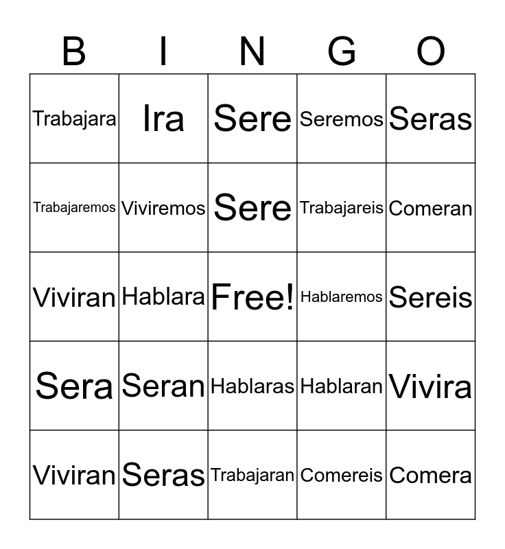 This bingo card has a free space and 39 words: Hablare, Comere, Vivire, Viviremos, Viviran, Hablaras, Sere, Comeras, Seras, Sera, Hablara, Seremos, Comera, Sereis, Hablaremos, Seran, Trabajare, Trabajara, Comeremos, Hablaran, Trabajaremos, Trabajaran, Trabajareis, Comeran, Hablareis, Comereis, Ire, Iras, Iremos, Ira, Ireis, Iran, Sere, Seras, Comereis, Vivireis, Vivira, Viviran and Vivireis.