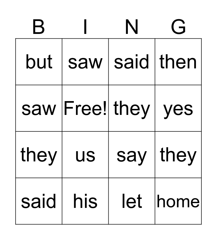 This bingo card has 16 words: his, they, said, but, they, saw, say, let, saw, Free!, said, then, us, yes, they and home.