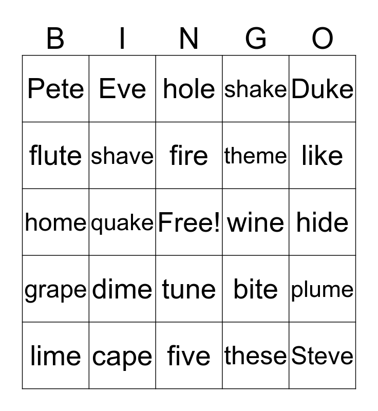 This bingo card has a free space and 29 words: lime, cone, quake, rule, Pete, hole, shave, dime, wine, cape, hide, Steve, five, these, like, pile, tune, grape, Duke, home, bite, save, theme, flute, shake, Eve, plume, fire and rope.