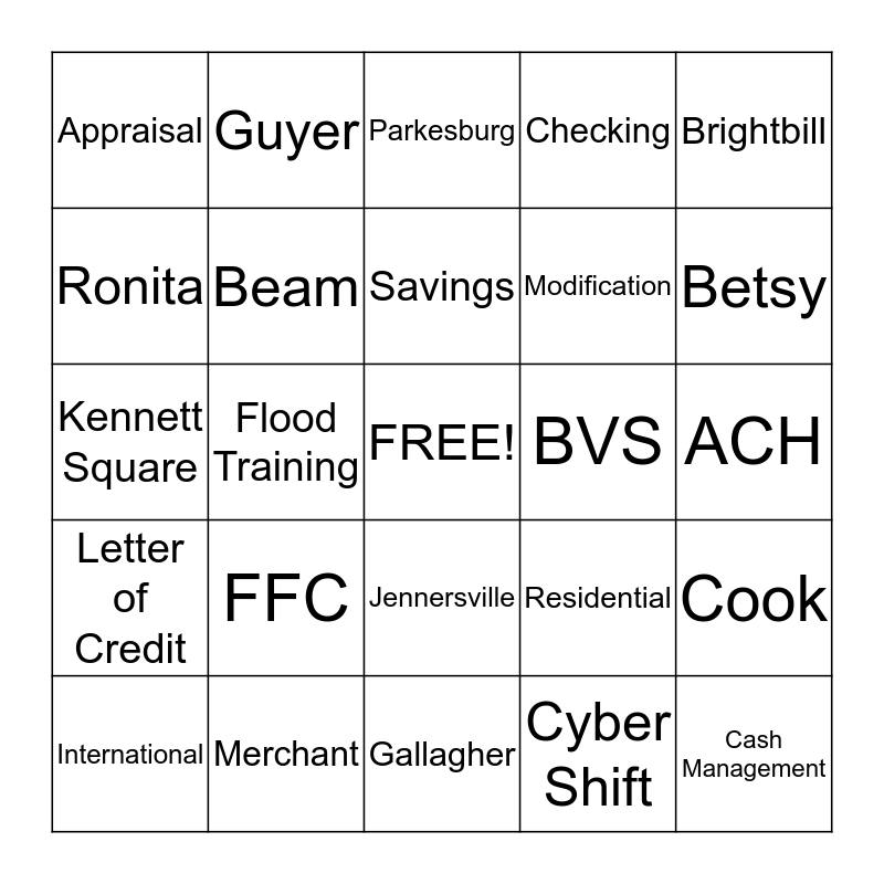 This bingo card has a free space and 29 words: International, Interest, Flood Training, Guthriesville, Appraisal, Parkesburg, Beam, FFC, BVS, Merchant, ACH, Cash Management, Gallagher, Cyber Shift, Betsy, Exton, Jennersville, Letter of Credit, Brightbill, Kennett Square, Residential, CLA, Modification, Ronita, Checking, Guyer, Cook, Savings and Mortgage Jeannie.