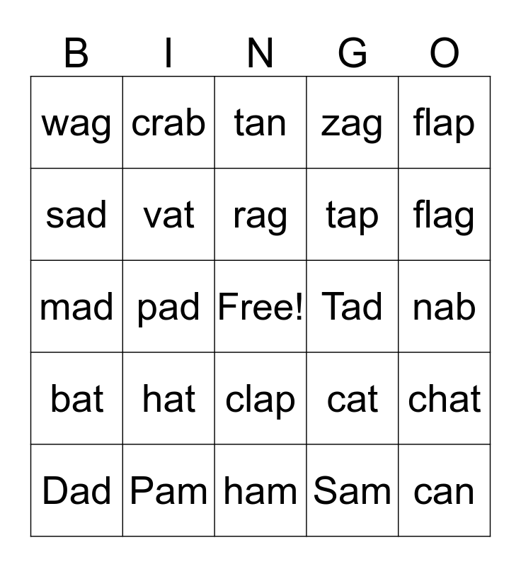 This bingo card has a free space and 24 words: hat, Pam, rag, Dad, flap, wag, sad, crab, Tad, clap, tap, mad, cat, chat, vat, Sam, nab, tan, flag, pad, can, bat, zag and ham.
