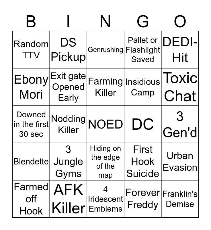 This bingo card has 25 words: Blendette, AFK Killer, NOED, Forever Freddy, DEDI-Hit, Random TTV, DS Pickup, Genrushing, DC, Urban Evasion, Ebony Mori, Exit gate Opened Early, 4 Iridescent Emblems, First Hook Suicide, Toxic Chat, Farmed off Hook, Nodding Killer, Farming Killer, Insidious Camp, 3 Gen'd, Downed in the first 30 sec, 3 Jungle Gyms, Hiding on the edge of the map, Pallet or Flashlight Saved and Franklin's Demise.