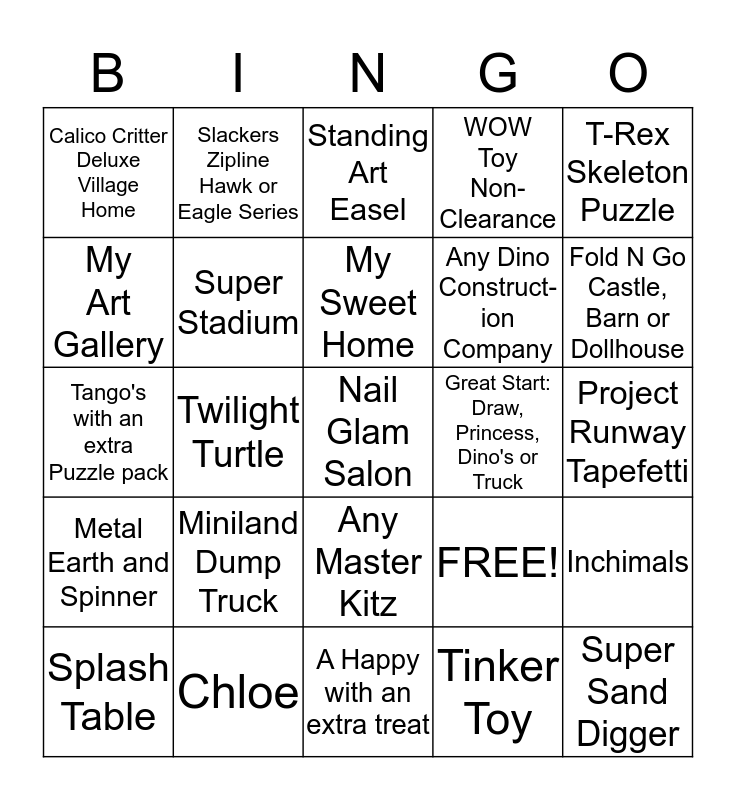 This bingo card has 25 words: Miniland Dump Truck, A Happy with an extra treat, My Sweet Home, Splash Table, T-Rex Skeleton Puzzle, Calico Critter Deluxe Village Home, My Art Gallery, Slackers Zipline Hawk or Eagle Series, Great Start: Draw, Princess, Dino's or Truck, Any Master Kitz, Any Dino Construct- ion Company, Tango's with an extra Puzzle pack, FREE!, Inchimals, Super Stadium, Super Sand Digger, Project Runway Tapefetti, Standing Art Easel, Fold N Go Castle, Barn or Dollhouse, Twilight Turtle, Nail Glam Salon, Chloe, Metal Earth and Spinner, WOW Toy Non-Clearance and Tinker Toy.