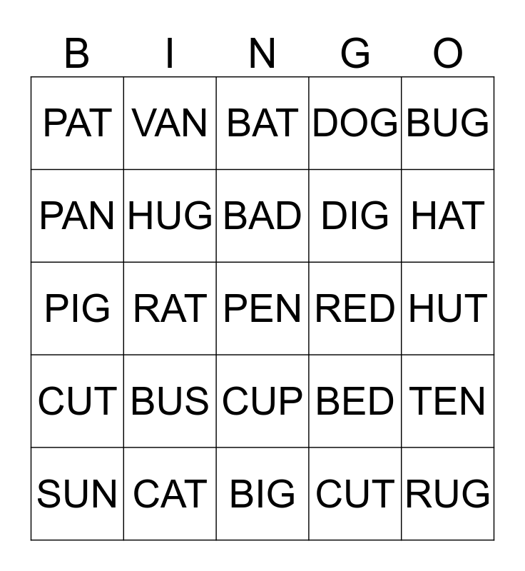 This bingo card has 25 words: BUS, BIG, BAD, SUN, BUG, PAT, PAN, VAN, RED, CUP, DIG, PIG, BED, TEN, HUG, RUG, HUT, BAT, HAT, RAT, PEN, CAT, CUT, DOG and CUT.