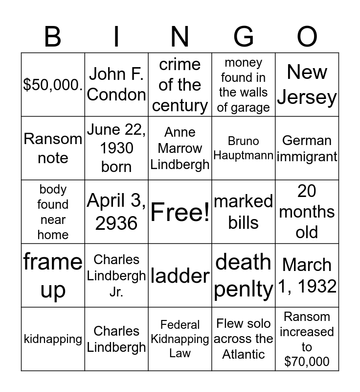 This bingo card has a free space and 24 words: Charles Lindbergh Jr., Charles Lindbergh, Anne Marrow Lindbergh, kidnapping, New Jersey, $50,000., Ransom note, John F. Condon, marked bills, ladder, Bruno Hauptmann, body found near home, death penlty, March 1, 1932, June 22, 1930 born, Flew solo across the Atlantic, 20 months old, crime of the century, German immigrant, April 3, 2936, Ransom increased to $70,000, frame up, money found in the walls of garage and Federal Kidnapping Law.