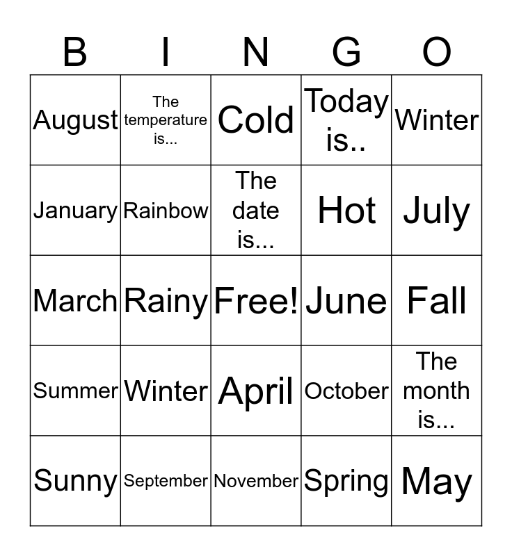 This bingo card has a free space and 29 words: Sunny, February, Rainy, Warm, August, Cold, Rainbow, Winter, June, September, Fall, May, November, Spring, July, Cloudy, April, Summer, Winter, March, October, Snowy, Hot, January, Today is.., The temperature is..., The month is..., The date is... and The day of the week is....