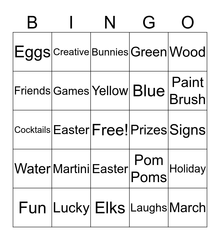 This bingo card has a free space and 29 words: Fun, Family, Easter, Shamrock, Eggs, Bunnies, Games, Martini, Prizes, Lucky, Signs, March, Elks, Laughs, Paint Brush, Purple, Easter, Water, Wood, Cocktails, Pom Poms, Craftini, Blue, Friends, Green, Creative, Holiday, Yellow and St. Pattys.
