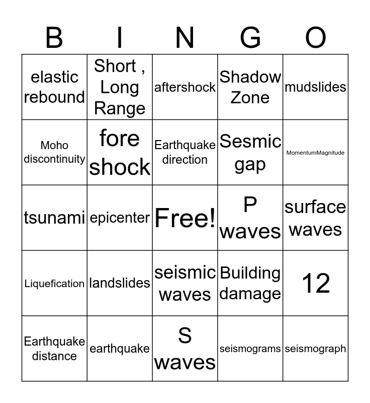 This bingo card has a free space and 30 words: earthquake, focus, epicenter, faults, elastic rebound, aftershock, fore shock, seismic waves, P waves, S waves, surface waves, seismograph, seismograms, Richter Scale, MomentumMagnitude, Modified Mercalli Scale, Building damage, Liquefication, landslides, mudslides, tsunami, fires, Short , Long Range, Sesmic gap, Moho discontinuity, Shadow Zone, 12, Earthquake distance, Earthquake direction and 95.