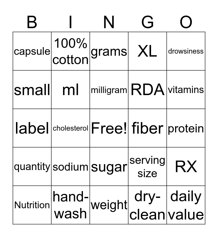 This bingo card has a free space and 29 words: Nutrition, ounce, cholesterol, calcium, capsule, grams, ml, sodium, fiber, hand-wash, protein, daily value, weight, dry-clean, vitamins, ingredients, sugar, quantity, drowsiness, label, serving size, calories, RDA, small, XL, 100% cotton, RX, milligram and medium.