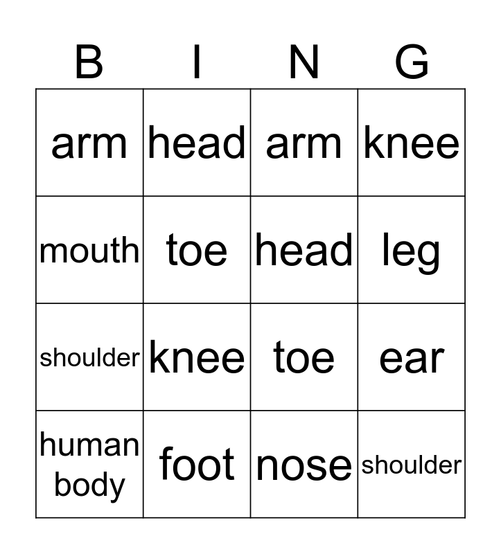 This bingo card has 23 words: shoulder, eye, leg, foot, mouth, arm, toe, head, human body, ear, knee, shoulder, eye, leg, foot, mouth, arm, toe, head, ear, knee, nose and hair.