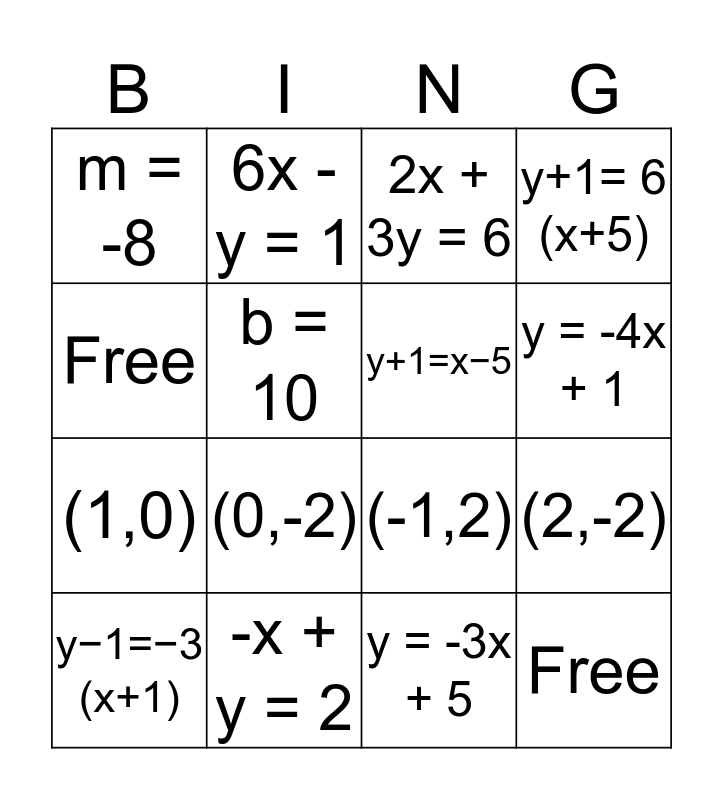 This bingo card has 16 words: -x + y = 2, (2,-2), 2x + 3y = 6, m = -8, (1,0), 6x - y = 1, (-1,2), y = -3x + 5, Free, b = 10, y−1=−3 (x+1), y+1= 6 (x+5), (0,-2), y = -4x + 1, y+1=x−5 and Free.