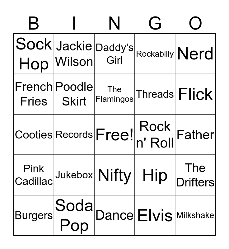 This bingo card has a free space and 29 words: Burgers, Daughter, Records, Daddy'O, Sock Hop, Daddy's Girl, Poodle Skirt, Jukebox, Rock n' Roll, Soda Pop, Father, Milkshake, Dance, Elvis, Flick, Greaser, Nifty, Pink Cadillac, Nerd, Cooties, Hip, Knuckle Sandwich, Threads, French Fries, Rockabilly, Jackie Wilson, The Drifters, The Flamingos and Roller Skates.