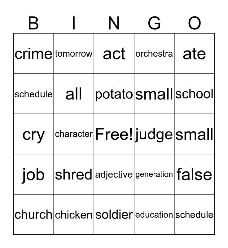 This bingo card has a free space and 29 words: church, box, character, next, crime, act, all, shred, judge, chicken, small, schedule, soldier, education, school, gym, adjective, job, ate, cry, generation, call, small, schedule, orchestra, tomorrow, false, potato and neither.