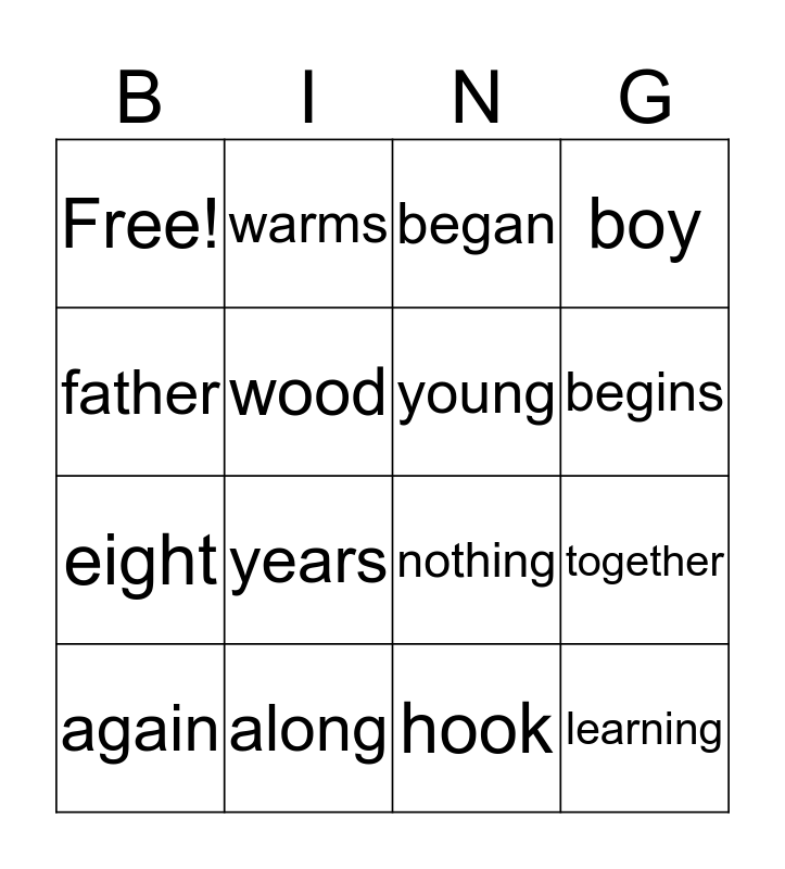 This bingo card has 16 words: again, along, began, boy, father, warms, nothing, together, Free!, wood, hook, begins, eight, years, young and learning.