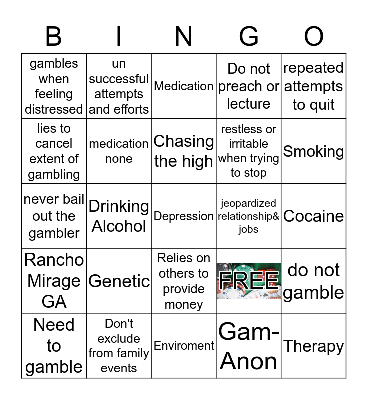 This bingo card has 1 images and 25 words: Genetic, Enviroment, Chasing the high, Need to gamble, repeated attempts to quit, gambles when feeling distressed, lies to cancel extent of gambling, un successful attempts and efforts, jeopardized relationship& jobs, Relies on others to provide money, restless or irritable when trying to stop, never bail out the gambler, FREE, do not gamble, medication none, Therapy, Cocaine, Medication, Smoking, Drinking Alcohol, Depression, Don't exclude from family events, Rancho Mirage GA, Do not preach or lecture and Gam-Anon.