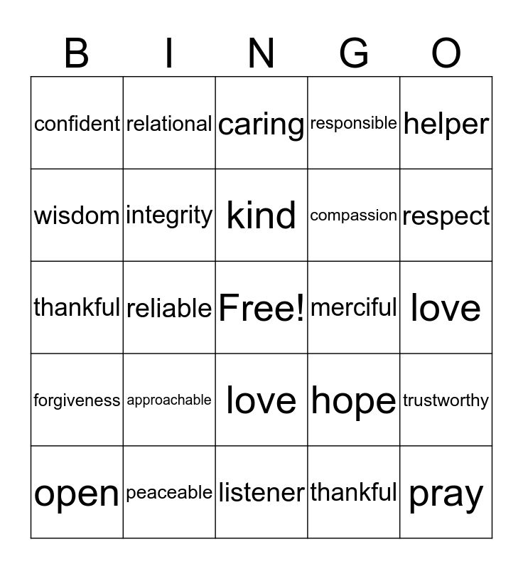 This bingo card has a free space and 29 words: open, faith, reliable, strong, confident, caring, integrity, approachable, merciful, peaceable, love, pray, listener, thankful, respect, encourager, love, forgiveness, helper, thankful, hope, positive, compassion, wisdom, responsible, relational, trustworthy, kind and generous.