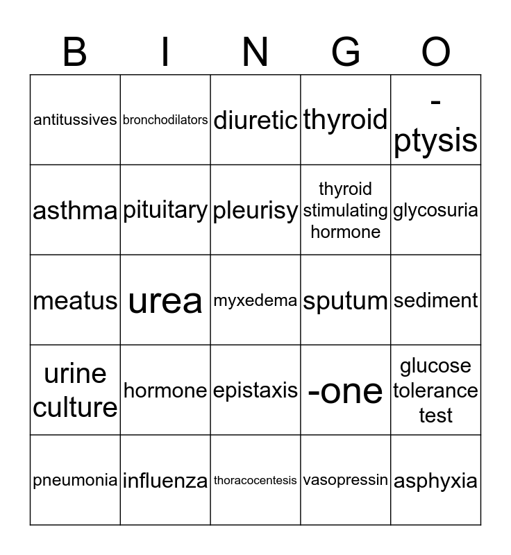 This bingo card has 25 words: hormone, thoracocentesis, pleurisy, pneumonia, -ptysis, antitussives, asthma, bronchodilators, sputum, epistaxis, thyroid stimulating hormone, meatus, -one, glucose tolerance test, pituitary, asphyxia, sediment, diuretic, glycosuria, urea, myxedema, influenza, urine culture, thyroid and vasopressin.