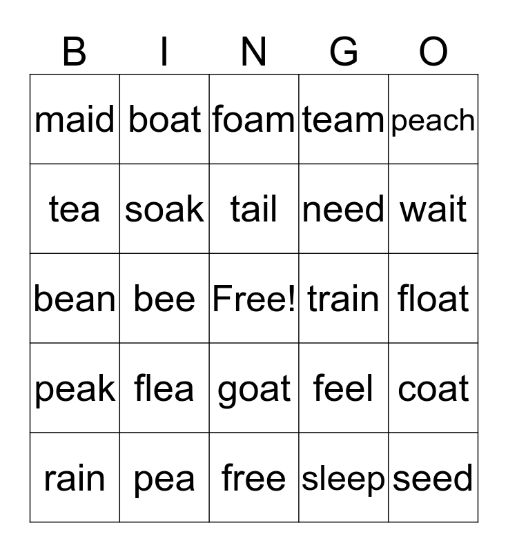 This bingo card has a free space and 30 words: pea, pail, bee, snail, maid, foam, soak, goat, train, free, float, seed, sleep, chain, wait, seal, feel, peak, flea, peach, bean, paint, boat, need, tea, team, coat, rain, tail and bead.