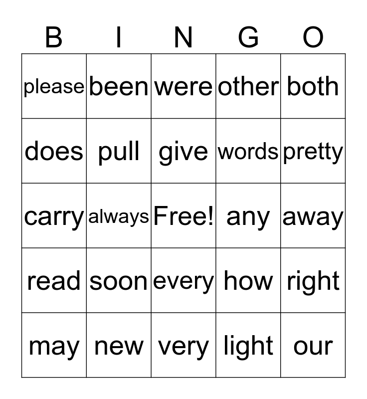 This bingo card has a free space and 30 words: new, thank, always, found, please, were, pull, every, any, very, away, our, light, never, pretty, again, how, read, soon, both, carry, going, been, words, does, other, right, may, give and number.
