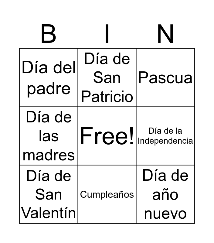 This bingo card has a free space and 10 words: Cumpleaños, Pascua, Día del padre, Día de año nuevo, Día de las madres, Día de San Valentín, Día de San Patricio, Día de acción de gracia, Día de la Independencia and Navidad.