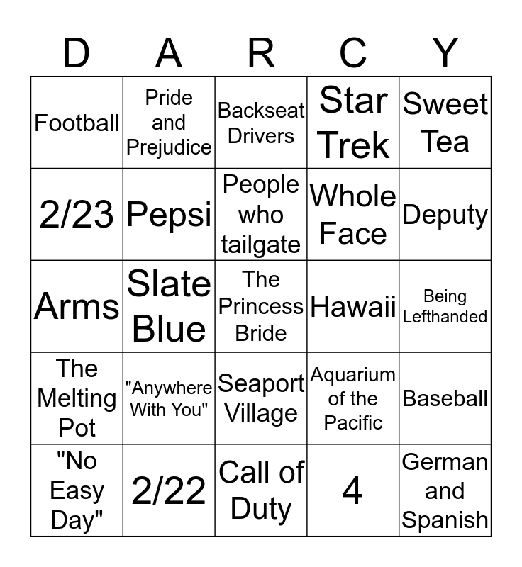 This bingo card has a free space and 33 words: Dewey, Navy Blue, Slate Blue, Green, The Melting Pot, Pepsi, Sweet Tea, "No Easy Day", Pride and Prejudice, "How to Train a Dragon", People who tailgate, Backseat Drivers, Barbara, UCSD, Hawaii, Deputy, 2/22, Arms, "Anywhere With You", Aquarium of the Pacific, Seaport Village, Nat Geo Wild, Football, Being Lefthanded, Call of Duty, German and Spanish, Star Trek, Whole Face, 2/23, Baseball, 3, 4 and 2.