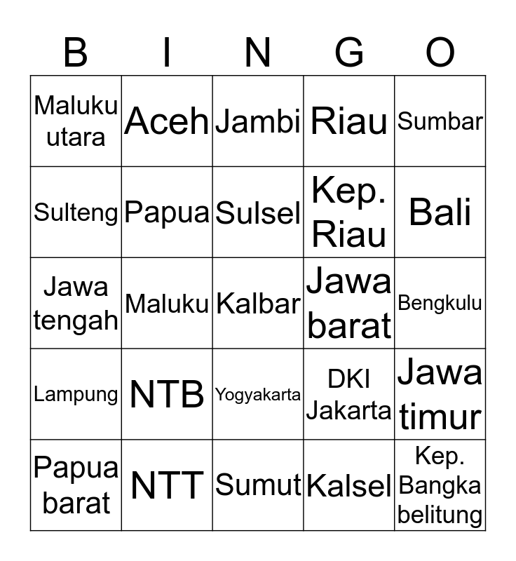 This bingo card has 25 words: NTB, Sumut, Sulsel, Papua barat, Sumbar, Maluku utara, Sulteng, Aceh, Jawa barat, Yogyakarta, Kep. Riau, Jawa tengah, DKI Jakarta, Jawa timur, Papua, Kep. Bangka belitung, Bengkulu, Jambi, Bali, Maluku, Kalbar, NTT, Lampung, Riau and Kalsel.