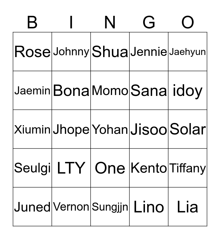 This bingo card has 25 words: LTY, Sungjjn, Momo, Juned, Jaehyun, Rose, Jaemin, Johnny, Jisoo, One, Sana, Xiumin, Kento, Tiffany, Bona, Lia, Solar, Shua, idoy, Jhope, Yohan, Vernon, Seulgi, Jennie and Lino.